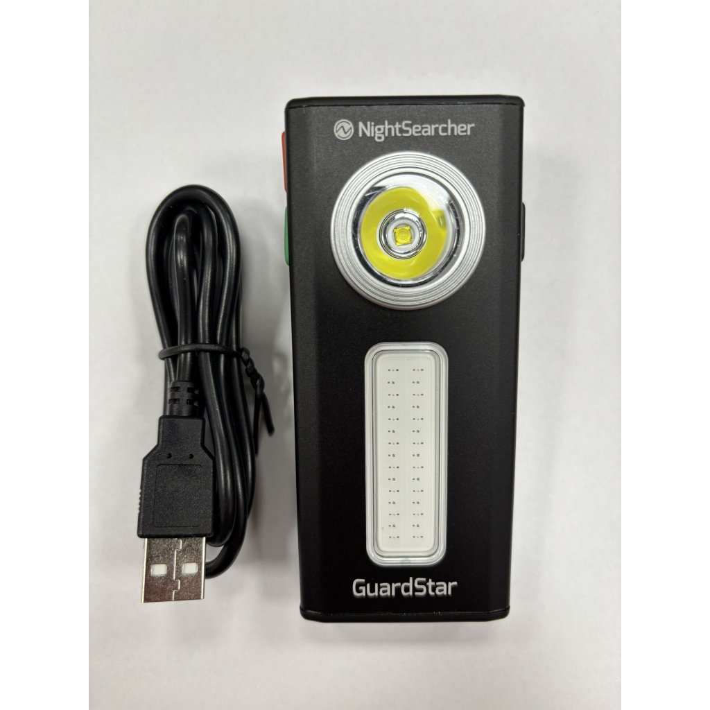 Guard Star je nová multifunkční svítilna od výrobce NightSearcher. Kromě bílé LED o maximálním výkonu nabízí i LED červenou a zelenou v podobě pásu pod hlavním reflektorem, tyto barvy lze použít jako výstražné, nebo třeba k řízení dopravy. Barevné LED mají i funkci blikání. Tělo je vyrobeni z hliníku a díky pevnému klipu lze svítilnu nosit na vestě, uniformě nebo třeba na batohu. Také díky sklápěcímu háčku ji lze kamkoliv zavěsit, nebo magnetem připevnit na kovový povrch. Akumulátor o kapacitě 1500 mAh zabezpečí chod na nejvyšší režim po dobu až 2,5 hodiny. Nabíjí se přes moderní USB-C konektor.