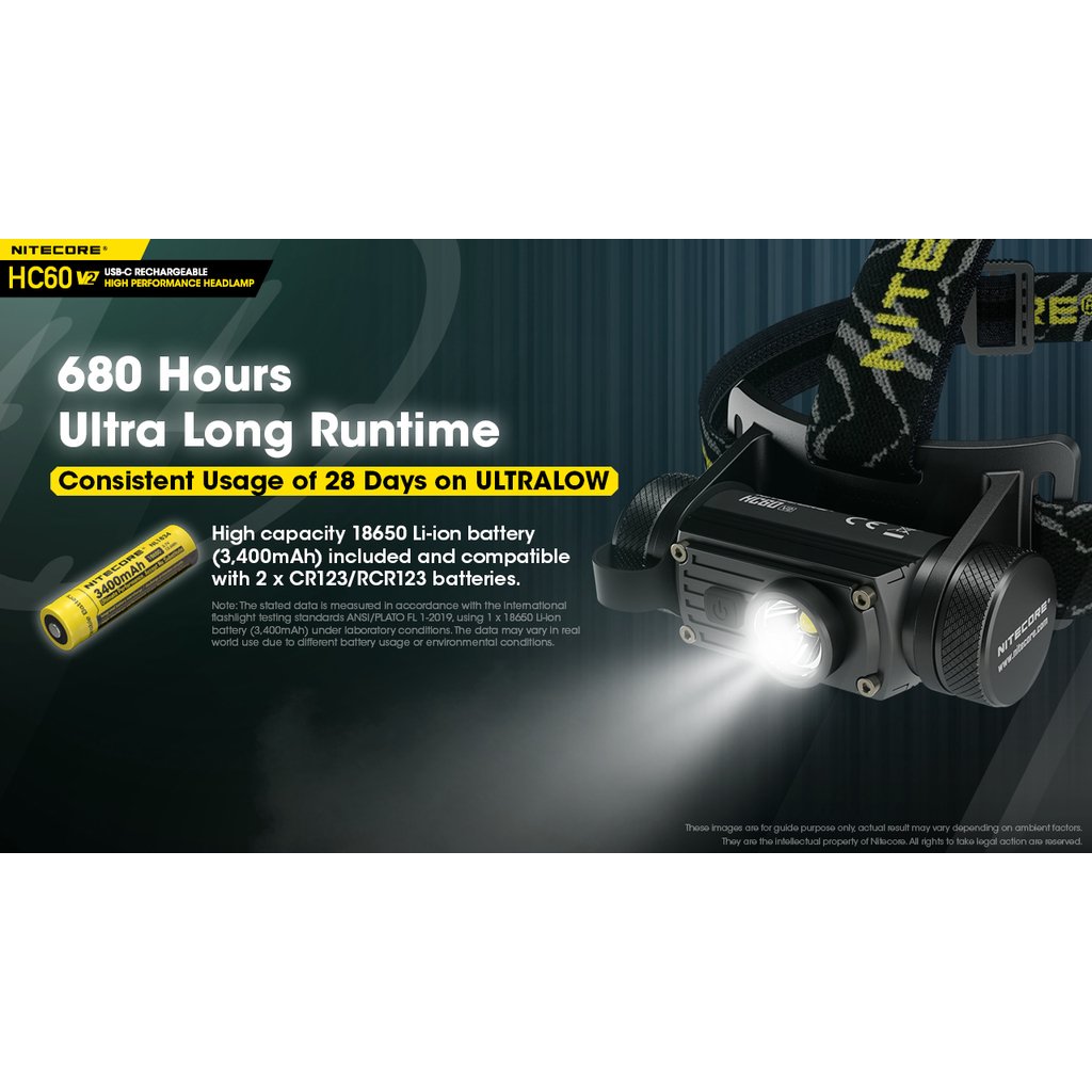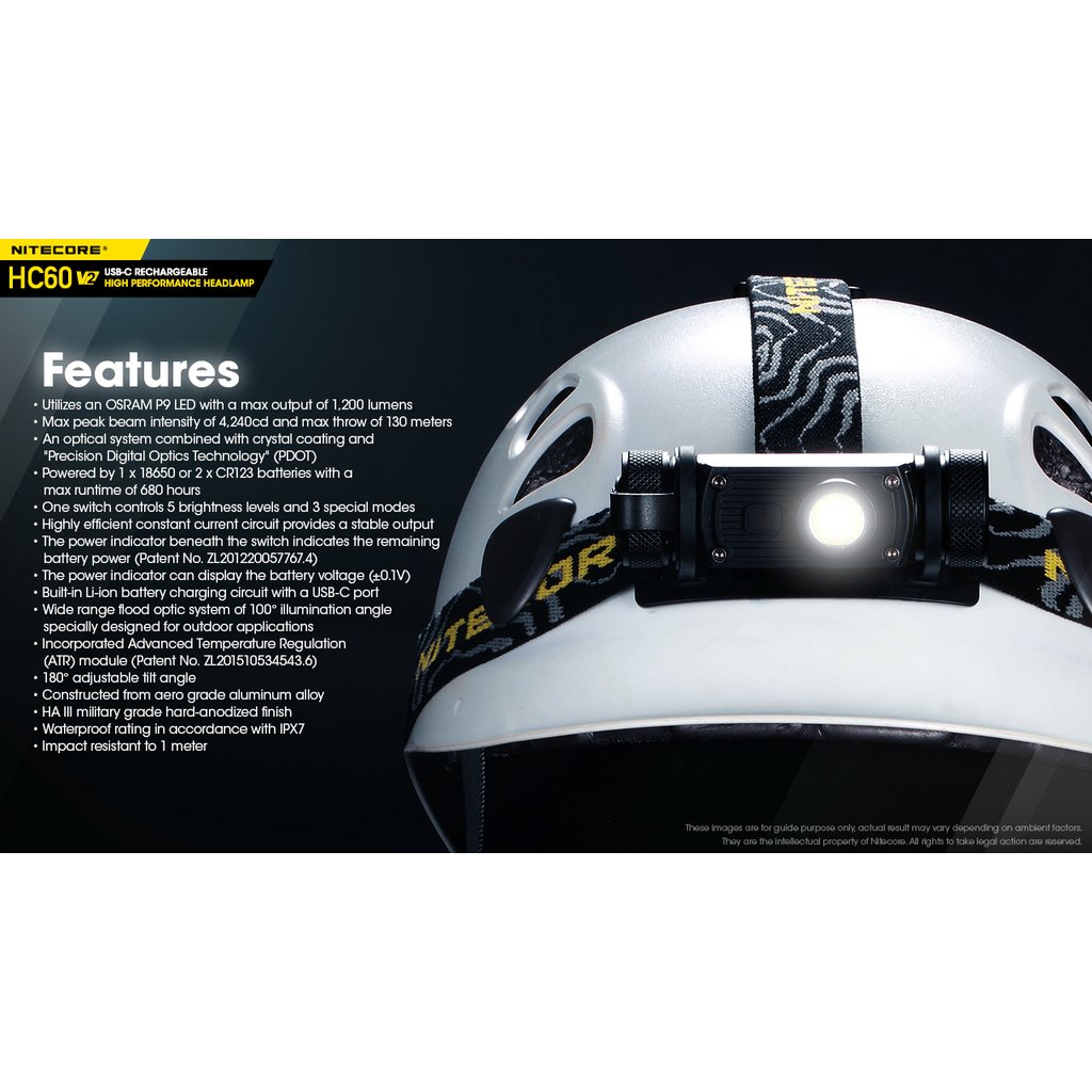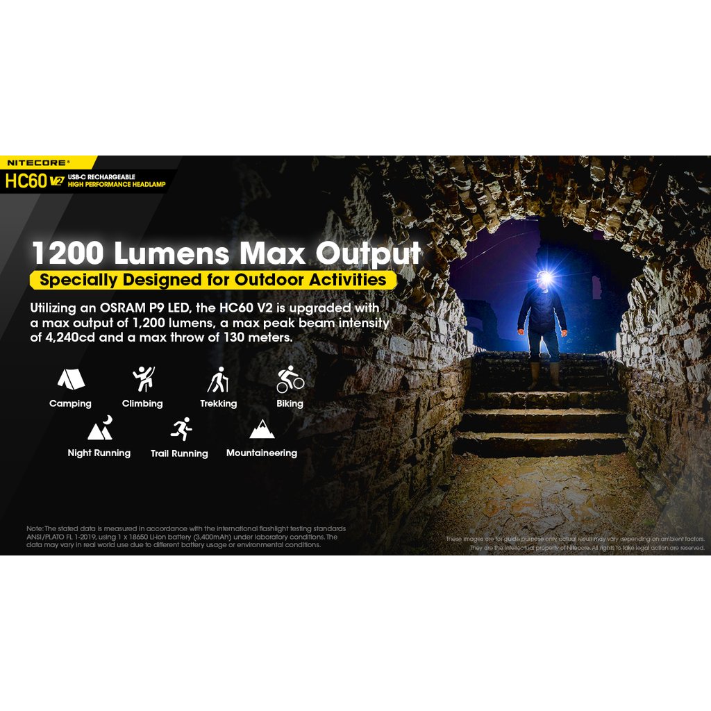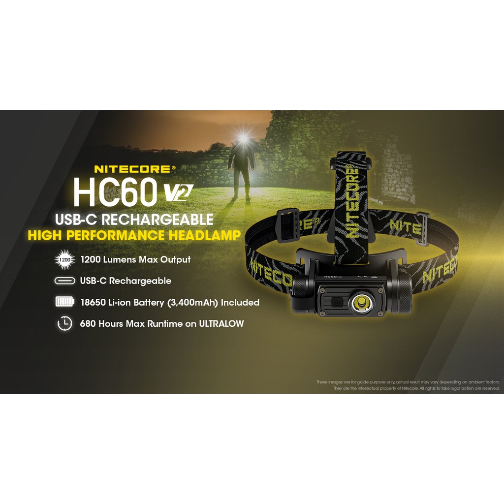 Nitecore HC60V2 je vylepšená výkonná čelová LED svítilna se světelným tokem 1200 lumenů, intenzitou světelného kuželu 4 240 candela a dosvitem do vzdálenosti až 130m. Jako zdroj světla je použita výkonná OSRAM P9 LED. Spolu s precizní parabolou vytváří široký světelný paprsek v úhlu 100°, tím zajišťuje uživateli perfektní periferní osvětlení prostoru. Součástí čelovky je nabíjecí akumulátor 18650 s kapacitou 3400mAh, který se nabíjí přímo ve svítilně nově přes konektor micro USB-C umístěným pod krytkou. Jednoduché ovládání jedním tlačítkem s volbou pěti světelných úrovní (turbo, vysoký výkon, střední výkon, nízký výkon a velmi nízký výkon). Tato čelovka má nově na vnitřní straně čelového popruhu umístěný silikonový pásek, pro lepší držení svítilny na hlavě nebo ochranné helmě. Dále se na zadní straně popruhu nachází gumová podložka, která se dokonale přizpůsobí zadní straně hlavy. Tato čelovka je vhodná pro pěší turistiku, horolezectví , kempink a rekreaci ve volné přírodě obecně. Čelovka je nárazuodolná z výšky 1 metru.