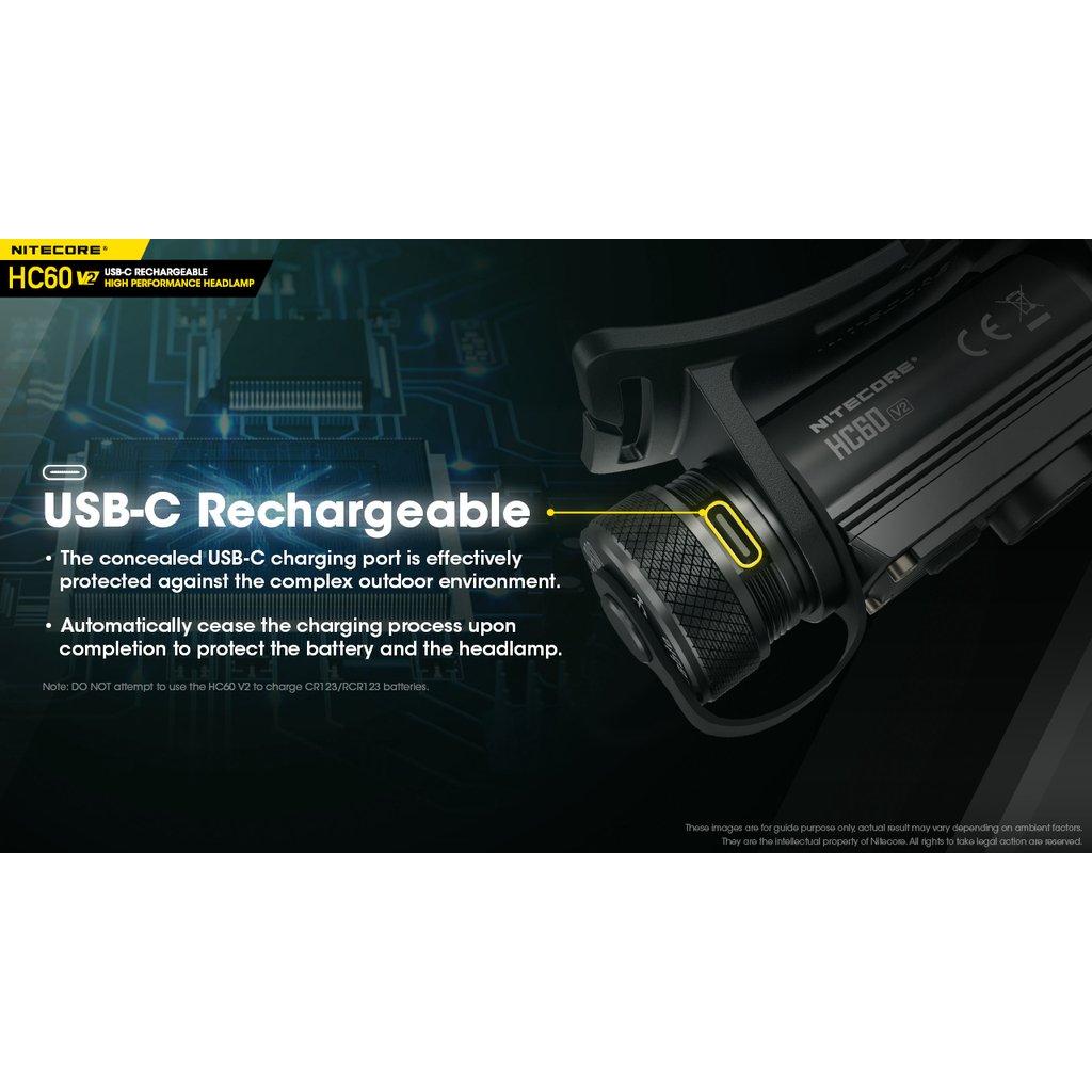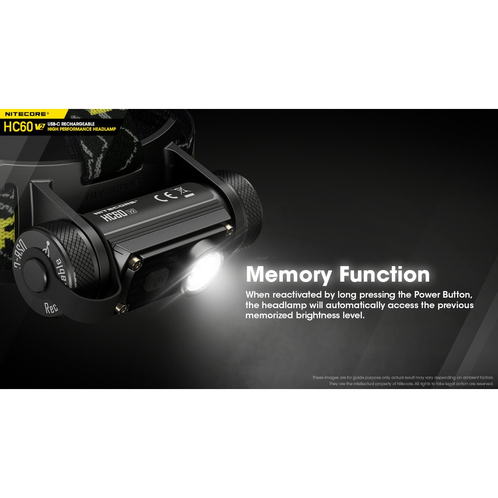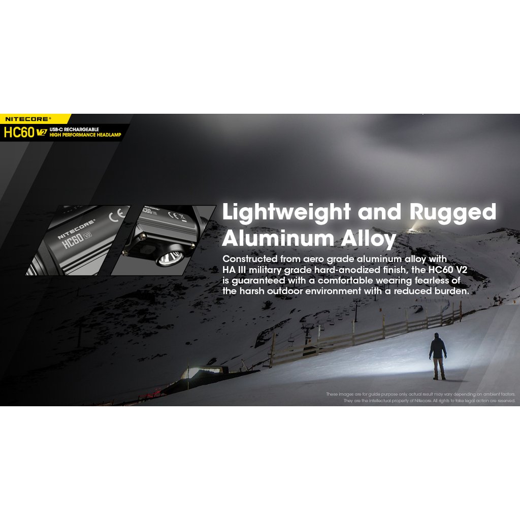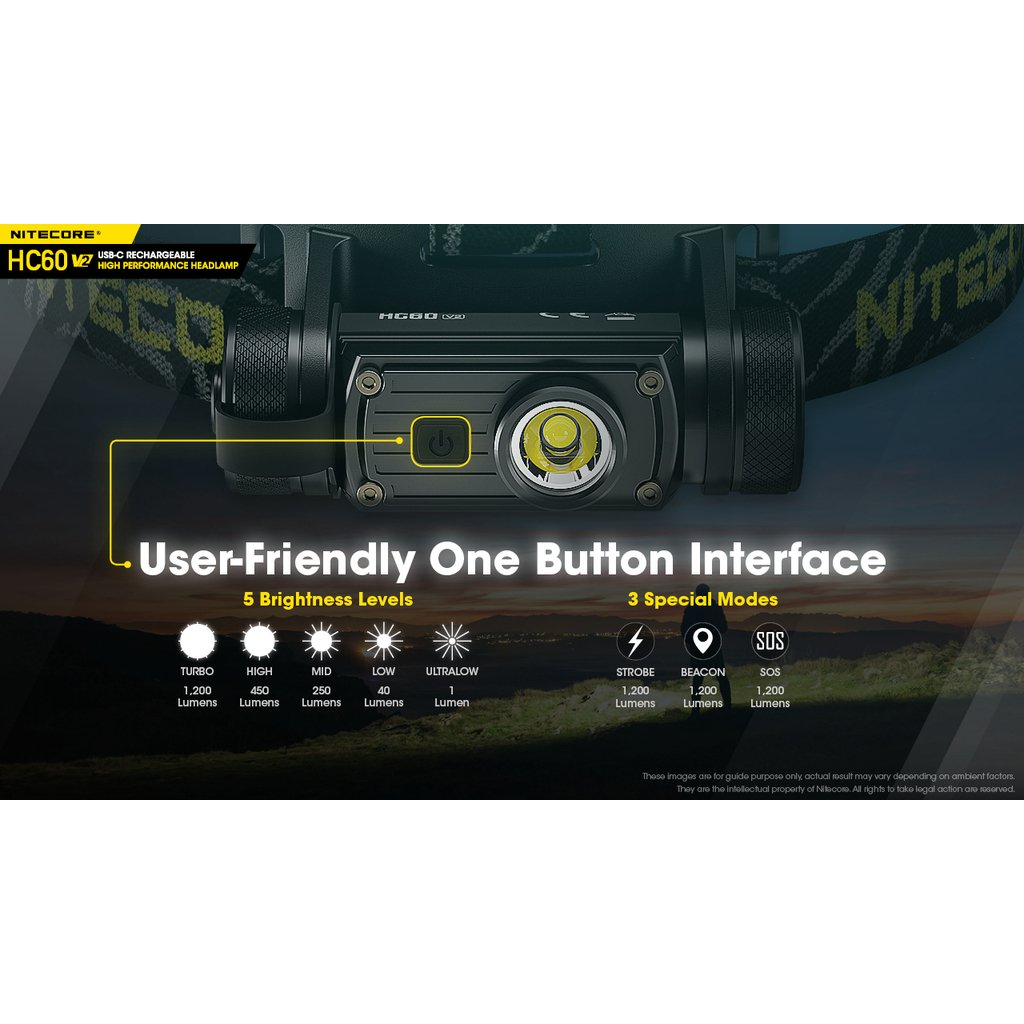 Nitecore HC60V2 je vylepšená výkonná čelová LED svítilna se světelným tokem 1200 lumenů, intenzitou světelného kuželu 4 240 candela a dosvitem do vzdálenosti až 130m. Jako zdroj světla je použita výkonná OSRAM P9 LED. Spolu s precizní parabolou vytváří široký světelný paprsek v úhlu 100°, tím zajišťuje uživateli perfektní periferní osvětlení prostoru. Součástí čelovky je nabíjecí akumulátor 18650 s kapacitou 3400mAh, který se nabíjí přímo ve svítilně nově přes konektor micro USB-C umístěným pod krytkou. Jednoduché ovládání jedním tlačítkem s volbou pěti světelných úrovní (turbo, vysoký výkon, střední výkon, nízký výkon a velmi nízký výkon). Tato čelovka má nově na vnitřní straně čelového popruhu umístěný silikonový pásek, pro lepší držení svítilny na hlavě nebo ochranné helmě. Dále se na zadní straně popruhu nachází gumová podložka, která se dokonale přizpůsobí zadní straně hlavy. Tato čelovka je vhodná pro pěší turistiku, horolezectví , kempink a rekreaci ve volné přírodě obecně. Čelovka je nárazuodolná z výšky 1 metru.