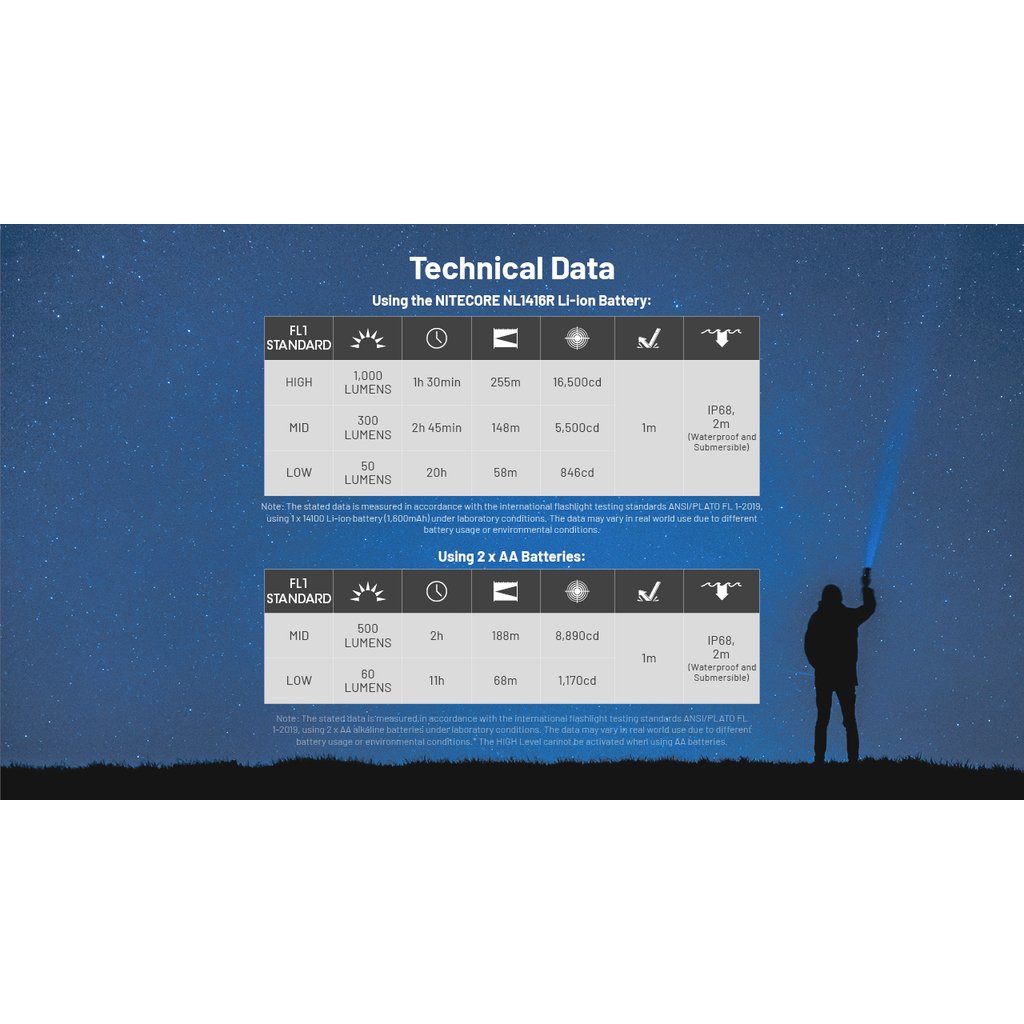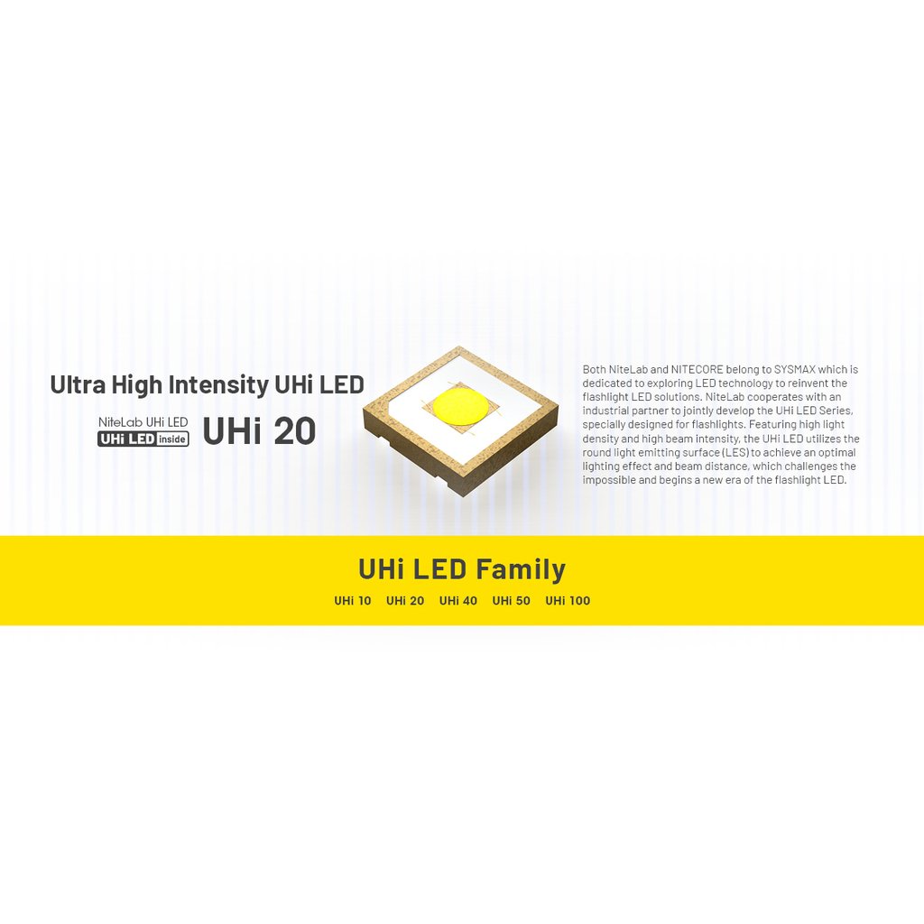- LED ruční svítilna, která jako zdroj světla používá nejmodernější výkonnou diodu NiteLab UHi 20 a je napájena nabíjecím akumulátorem Nitecore NL1416R o kapacitě 1 600mAh nabíjeným přes USB-C port