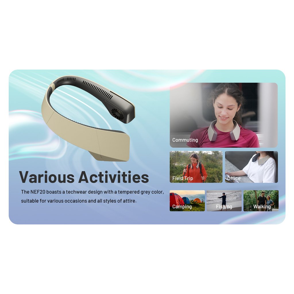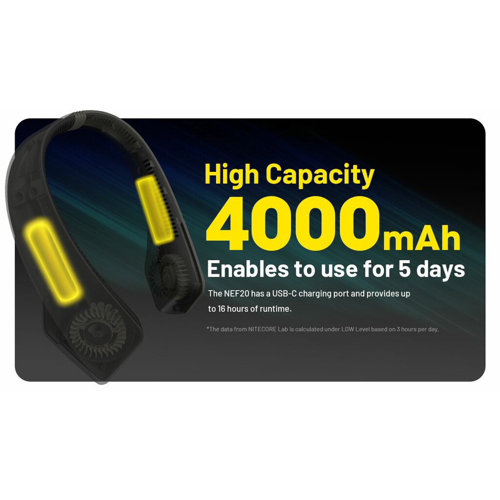 NEF20 je nový větráček na krk od výrobce NITECORE. Se třemi úrovněmi lze přesně nastavit výkon, který pro vás bude komfortní. Díky zabudovanému 4000mAh akumulátoru lze používat až 16 hodin. Jednoduše se ovládá jedním tlačítkem a je vyroben z velice odolného a pružného ABS. Nabíjení obstarává USB-C, díky kterému nezabere více než 2 hodiny (v případě použití 2A nabíječe).