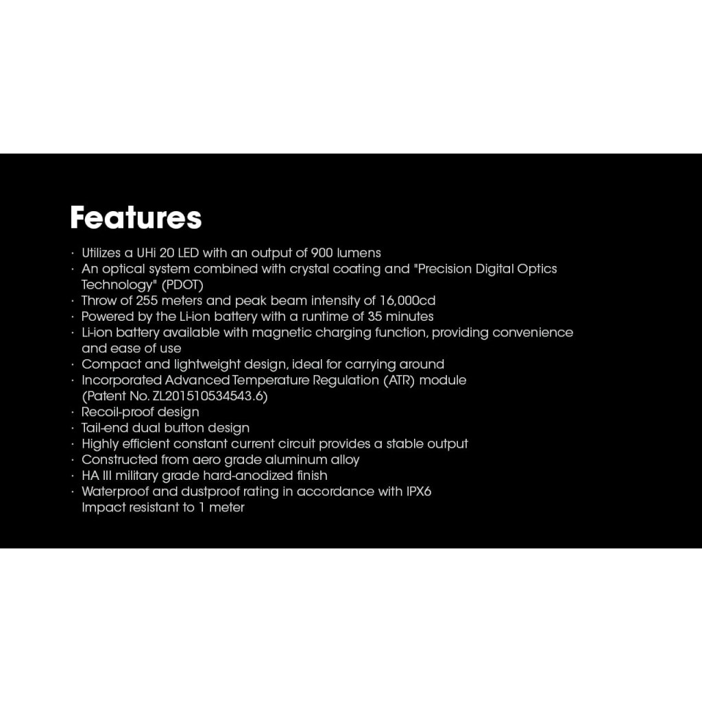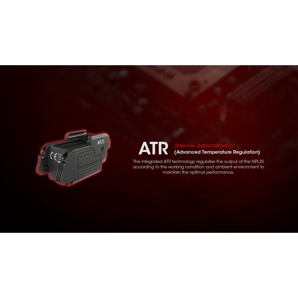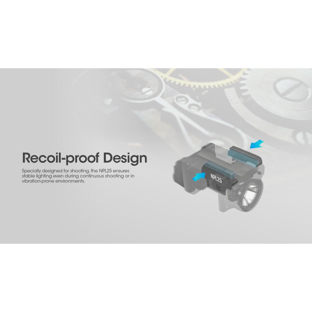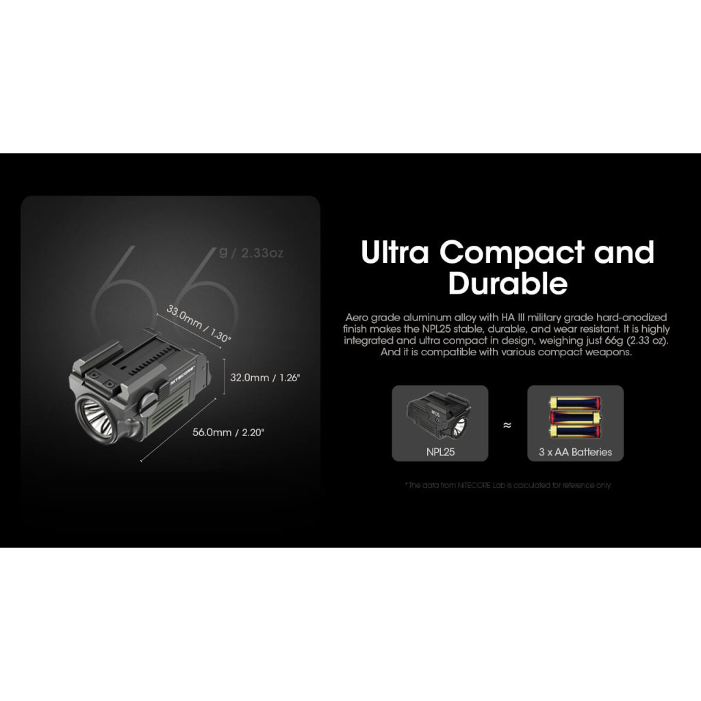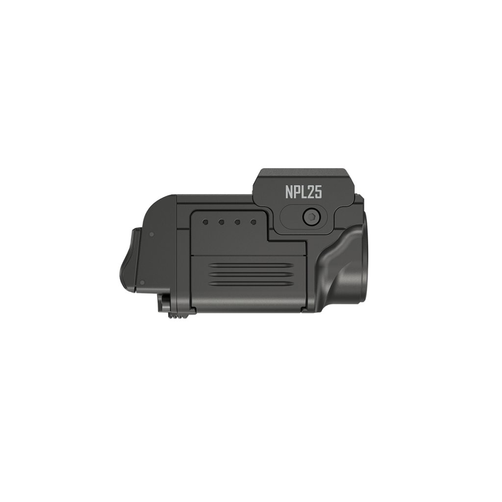 Pro rok 2023 přišla společnost Nitecore s novinkou v podobě nabíjecí podvěsné pistolové svítilny NPL25. Je první nabíjecí svítilna pod zbraň od společnosti Nitecore.Jako zdroj světla používá Nitecore Pistol Light 1 x LED diodu NiteLab UHi 20 LED vyrobenou přímo společností SYSMAX. Výkon svítilny je 900 lumenů (intenzita svitu 16 000cd) s maximálním dosvitem až 255 metrů. Tomu napomáhá precizní digitální optická technologie reflektoru (PDOT). Napájení zajišťuje vyměnitelný akumulátor o kapacitě 500mAh, který se nabíjí magneticky za pomoci přiloženého kabelu (je součástí balení). Stav nabitosti akumulátoru zjistíte díky tlačítku a 4 diodám nacházejícím se přímo na akumulátoru. Při plně nabité svítilně je doba provozu 35 min. NPL25 má možnost volby mezi silným světlem jak momentovým, tak konstantním. Režimy svitu se ovládají za pomoci tlačítek na konci svítilny (u lučíku zbraně) namáčknutím, nebo promáčknutím tlačítek. Svítilnu lze pohodlně ovládat jak silnou, tak i slabou rukou. To je výhoda jak pro levoruké, tak i pravoruké střelce. NPL25 lze lehce nasadit na většinu zbraní opatřených Picatinny railem za pomoci upevňovacího šroubu. Vzdálenost svítilny od lučíku doladíte na míru zbraně díky kolejnici na horní straně svítilny. Přední čočka je oboustranně potažena vrstvou proti poškrábání, stupeň krytí IP66 a nárazuvzdornost je testována z výšky 1 metru. Tělo je vyrobeno z leteckého hliníku s černým eloxem HAIII military.
