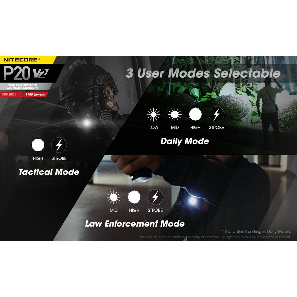 P20 V2 je nová taktická LED svítilna, která vychází z úspěšné svítilny P20. Jako zdroj světla používá LED CREE XP-L2 V6 s výkonem max. 1100 lm. Díky použité elektronice je svítilna uzpůsobena na akumulátory 18650, RCR123A i lithiové baterie CR123A (nejsou součástí balení) . Duálním spínačem můžete podle potřeby volit 3 hlavní režimy: Taktický - umožňuje volbu vysokého výkonu a stroboskopu, Hlídkový - umožňuje volbu vysokého nebo středního výkonu a stroboskopu, Denní - umožňuje volbu buď vysokého,středního nebo nízkého výkonu a stroboskopu.Svítilna je opatřena duálním patním spínačem, který umožňuje okamžitou aktivaci stroboskopu. Hluboká precisní parabola vytváří úzký světelný paprsek s dosvitem 222 m. Jako další technické přednosti svítilny P20 V2 jsou: tělo vyrobené z pevného leteckého hliníku s povrchovou úpravou HA III Military (černý elox), paměť navoleného světelného výkonu, ochrana proti nesprávnému vložení baterie, duální spínač poskytující pohodlné a jednoduché ovládání (patentováno), nerezový klip a odolnost svítilny vůči vodě a nárazu. Součástí balení je také praktické taktické pouzdro na opasek NTH20.