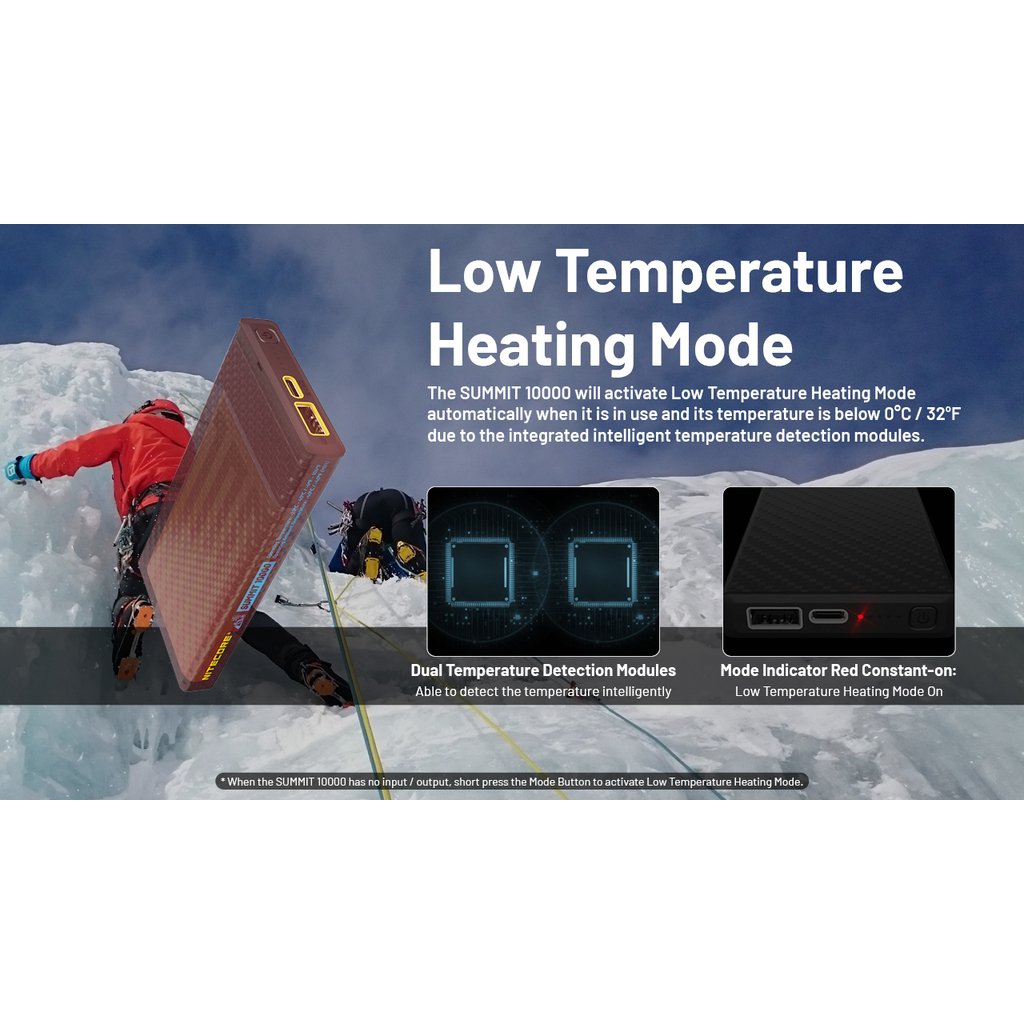 První powerbanka do chladného podnebí s odolným karbonovým pouzdrem. Kromě své odolnosti Vás ohromí svojí nízkou váhou, možností fungovat za nízkých teplot až do 40°C a nabíjecím výkonem, který přes USB-C dosahuje až 3A. Kapacita powerbanky je 10000 mAh, čili s ní nabijete cca 2x iPhone 14 Pro, 1,5 x Huawei Mate 50 Pro, 4 x čelovku Nitecore UT27 nebo 1,5 x akumulátor 18650 s kapacitou 3 500mAh. Nejlehčí powerbanka tohoto druhu na světě se chlubí váhou 172g a rozměry menšího mobilního telefonu (125,5 x 63,5 x 14,5 mm). Jedná tedy o velice malou a kompaktní powerbanku, kterou si přibalíte kamkoliv na cesty a ani o ní nebudete vědět. SUMMIT 10000 lze uvést do režimu nízkého proudu pro nabíjení slabších zařizení jako jsou např. fitness hodinky nebo bezdrátová sluchátka. Díky indikátoru nabítí, umístěného pod zapínacím tlačítkem jednoduše zjistíte kolik kapacity Vám ještě zbývá. Pokud spadne okolní teplota po 0°C v powerbance se zapne režim nízkoteplotního vytápění. To se automaticky sepne i při nabíjení v nízkých teplotách. Odolnost je dle IPX5, tudíž je odolná vůči dešti a sněhu. Odolná proti pádu je z 1,5 metru. Ultranízká spotřeba energie, první powerbanka odolná vůči chladu na světě, režim vytápění, to jsou hlavní výhody Summitu 10000. Vhodná pro polárníky, lyžaře, fotografy a vůbec všechny outdoorové nadšence, kteří tráví svůj volný nebo pracovní čas ve chladných podmínkách. K Summitu 10000 se dodává kabel USB-C / USB-C a izolační přepravní vak.