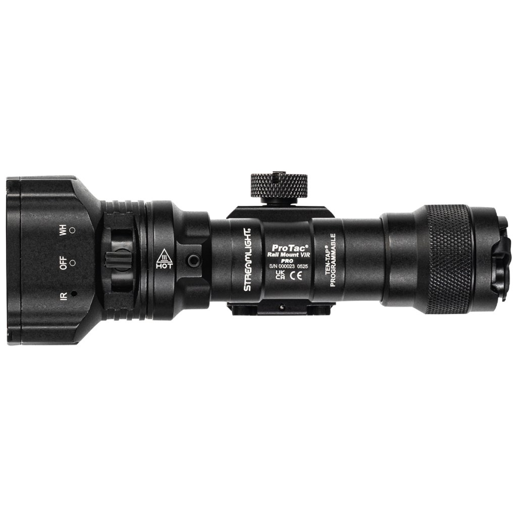 PROTAC RAIL MOUNT VIR PRO je první pušková svítilna od společnosti Streamlight s infračerveným přísvitem. Výkon svítilny: 1 100 lumenů. Intenzita svitu: 40 000 candela Dosvit: 400 metrů Výkon IR přísvitu: 2 300 mWh Vlnová délka IR přísvitu: 940nm Přepínání jednotlivých režimů: Pusuvná páčka na hlavě svítilny Možnost uzamčení svítilny: Ano To jsou hlavní přednosti nové svítilny určené pro dlouhé zbraně. Napájení svítilny již zajišťuje nabíjecí akumulátor velikosti 18650 a kapacitě 2 600mAh s nabíjením přes USB-C port nacházející se přímo v těle akumulátoru (součástí balení). Svítilna si zachovala možnost duálního napájení a můžete použít i 2 x CR123 jednorázové baterie. PROTAC RAIL MOUNT VIR PRO je opatřen duálním patním víkem s otvorem na kabelový dálkový spínač. Patní víko je opatřeno i tlačítkem ovládání svítilny bez nutnosti použití kabelového spínače. Standardem je perfektní optika, která vytváří koncentrovaný paprsek světla s optimálním periférním svícením. Svítilna je vybavena integrovanou montáží na picatinna rail (MIL-STD1913) a montáží na M-LOK. VIR PRO nabízí 3 režimy svitu bílého světla (Vysoký, Střední, Nízký) IR přísvit má dva režimy svitu (Vysoký a Nízký). Je určena pro střední a dlouhé zbraně. Díky použitým materiálům bezpečně odolává zpětným rázům. Světelný výkon lze otestovat na virtuální střelnici zde.
